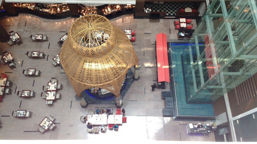 A quick security check and I was escorted in the spacious lobby or atrium….Needless to say I was super impressed with the grandiose space that welcomed me. While the husband busied himself with formalities at the reception, I roamed about observing the magnificently large chandelier that reached all the way down hanging from the upper floors, the multi-colored murals that adorned the walls, the little coffee counter tucked away in one corner of the lobby, the capsule lift that rode up and down noiselessly and the extra large floral arrangement that brought the entire glass and granite interiors alive…