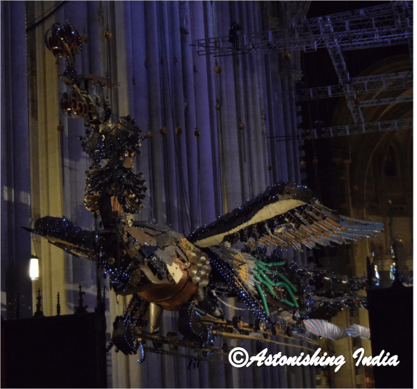 The cathedral was hosting a display of two huge birds; a pair of Phoenixes, male Feng and Huang the female fashioned out of salvage and architectural debris from construction site at World Financial Center, Beijing, that were exhibited in the soaring nave of the church.  The birds are the brainchild of internationally acclaimed artist Xu Bing.